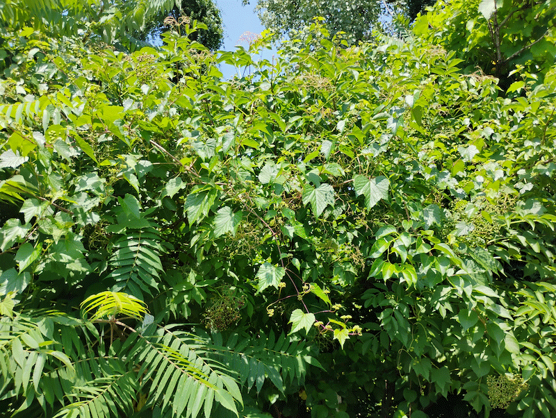 I think these types of vine infestations are beautiful! The way they blanket an area and turn it into a sea of leaves... it's a common sight in these types of roadside waste areas where trees grow.