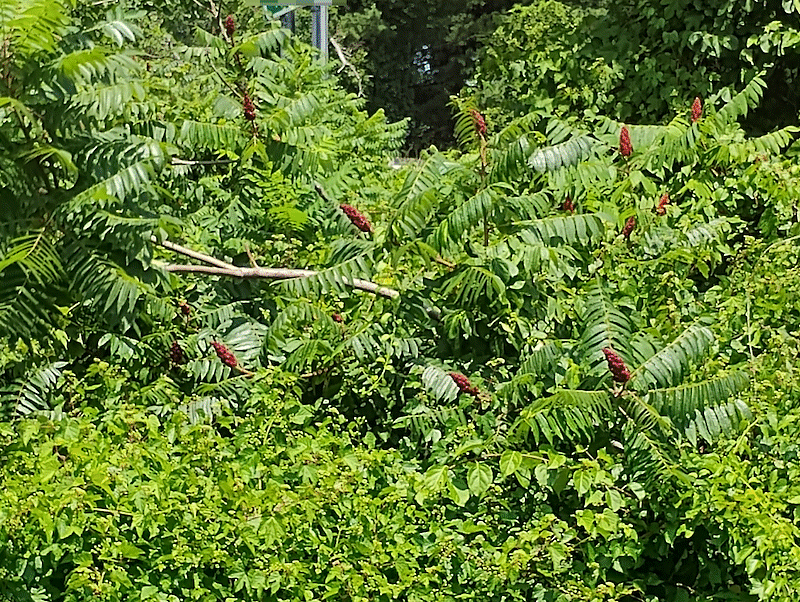 Of course, bordering the waste land was a classic strip of roadside pseudo-forest: sumac, bittersweet, and grape. Sumac is very distinctive even without its lumpy red fruits! They really stand out wherever they are.